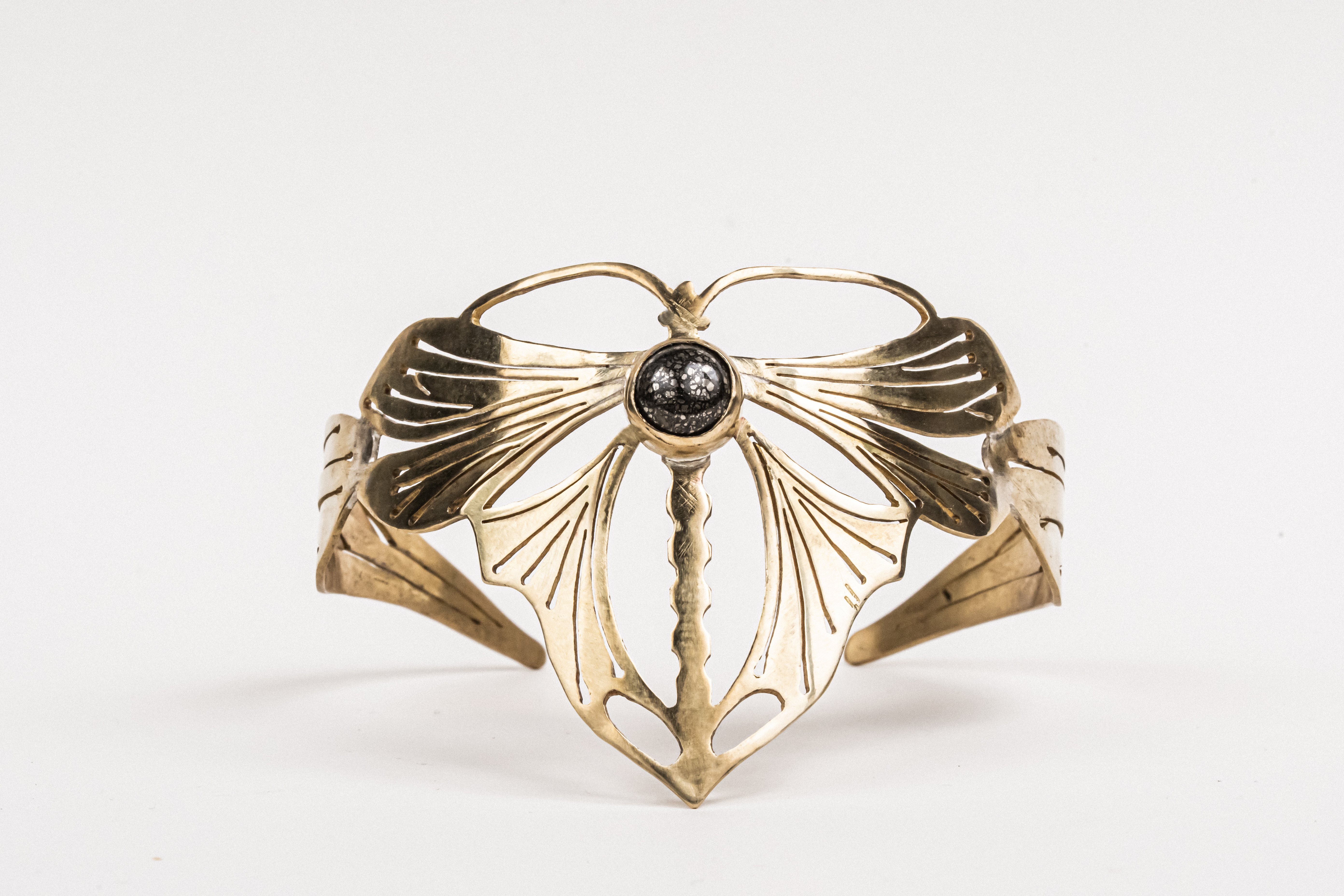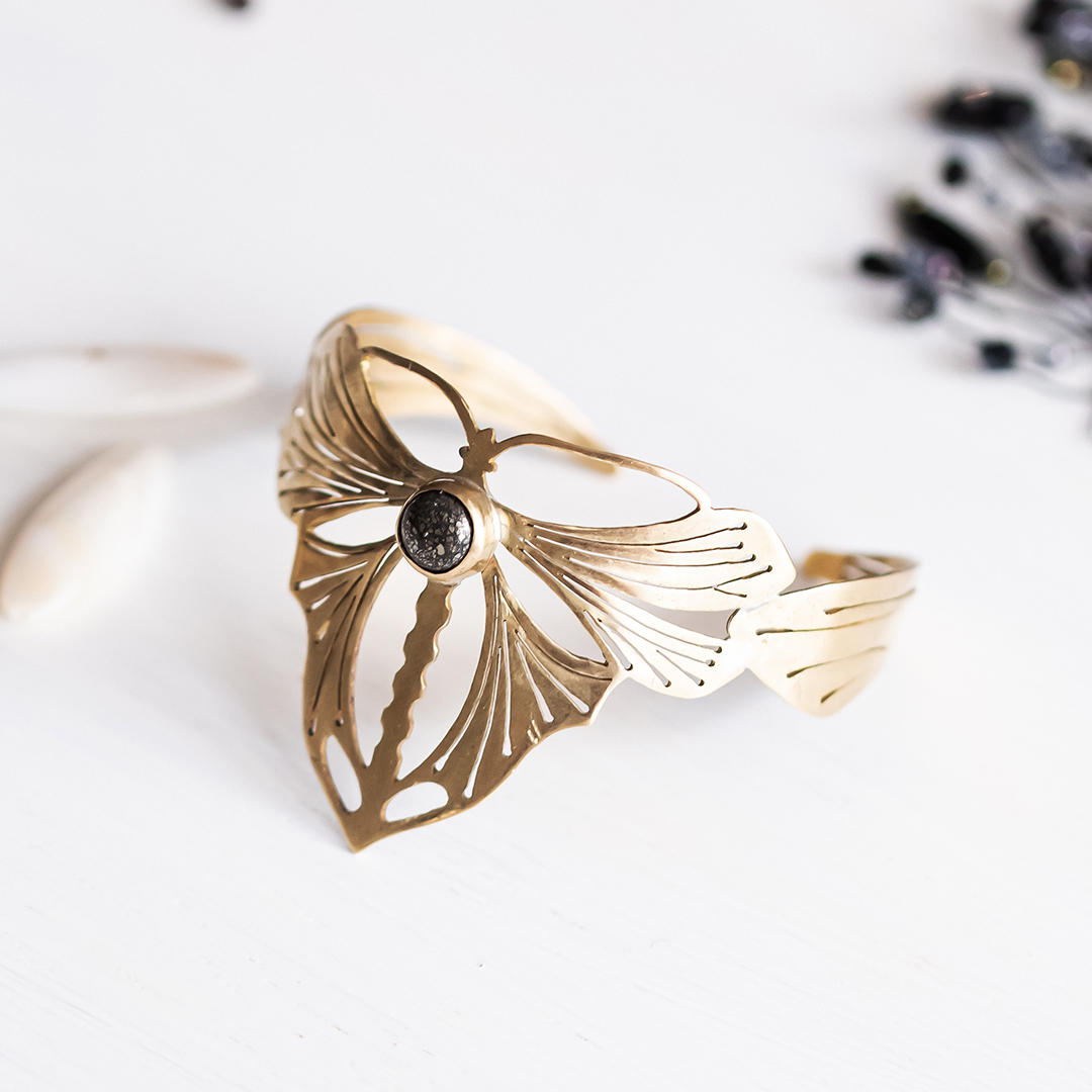Handcrafted bracelet inspired by Art Nouveau, displaying a delicate centered butterfly decorated with a marcasite stone.